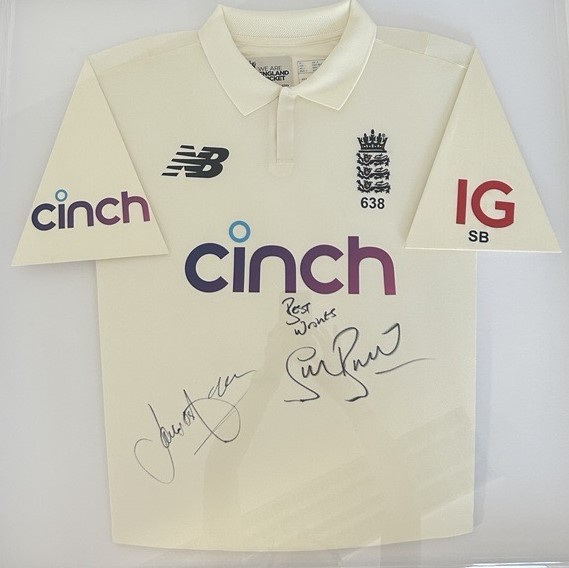 2. Framed England cricket shirt signed by Stuart Broad and Jimmy Anderson