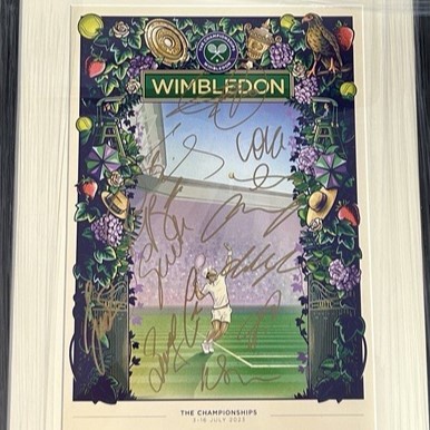 4. An official framed Wimbledon 2023 poster signed by the Men’s Finalists, Carlos Alcaraz and Novak Djokovic, and Andy Murray among others